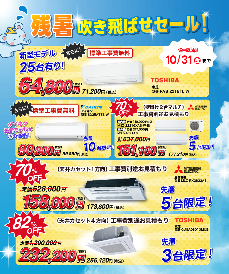 9月29日(日)〜10月31日(木)限定セール開催! まだまだ暑い日が続くこの季節。「今さらエアコンを買うのはどうかな…」と迷っている方に朗報です! エアコン元気は、残暑を涼しく乗り切るだけでなく、これからやってくる冬の […] -