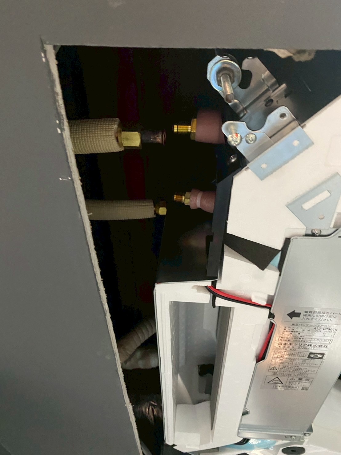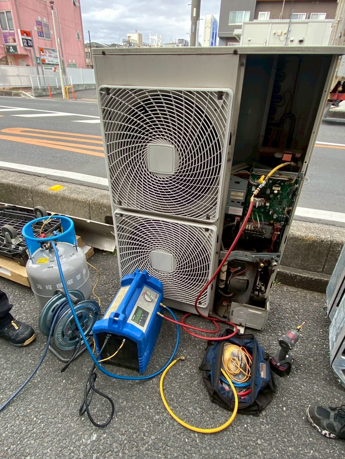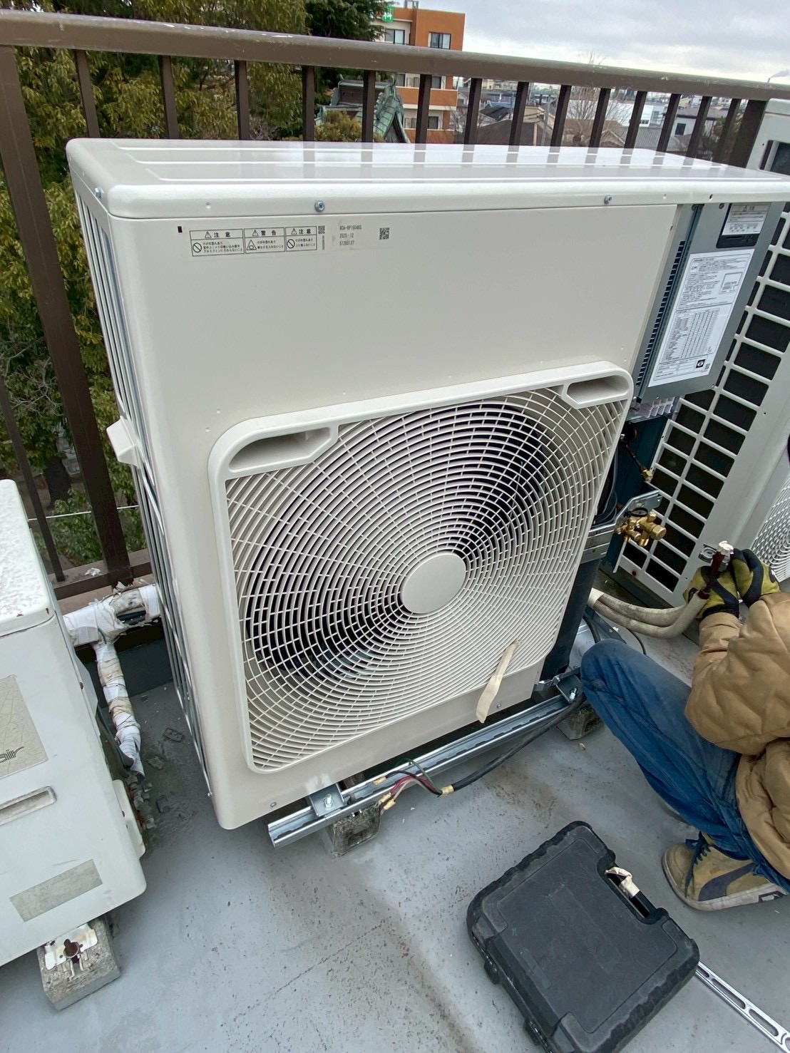 | 備考・コメント | 今回は、業務用天井カセット形4方向同時ツインエアコン更新工事のご依頼頂き施工させて頂きました! ※同時ツイン形とは、リモコン1台で室内機複数台を同時に稼働させられるタイプのものです! エアコン更新時に同時→個別で動かせるように変更することも可能です♪ 既存機器は、古く電源を入れても風が出ない状態でした。 真冬の寒い時期にに急に止まってしまったそうでビックリされてました。 作業経路・スペースが汚れないように養生作業からしていきます。 既存機器を取り外し、既存配管内の汚れを取るため窒素にて洗浄致しました! 外した室外機からフロンガス回収作業を行います。 室内機吊元金具は、ダイキン→東芝への更新でしたが金具を微調整し再利用出来ました! 配管類は、既存設備されているものを加工し再利用接続させて頂きました♪ 室内機は、2名作業にて慎重に吊元金具へ吊って高さ調整致します。 室外機も、大きく重たいのですが階段を使用させて頂き人力2名作業にて慎重に搬出入作業致しました! 室外機コンクリートブロックを再利用しダクターにて足元固定位置を調整し室外機設置致しました! 新しいワイヤードリモコンはバックライト付きで見やすく操作性も向上しております♪ エアコン入替設置後、配管真空引き・試運転を行い工事は5時間程で完了致しました! ※プロのエアコン専門店エアコンげんきでは、業務用エアコンも経験豊富な有資格者が施工致しますのでご安心してお任せください! 店舗内は、暖房がしっかりと効き暖かく快適になりお客様には大変喜んで頂けました♪ 現地調査・見積もり完全無料! グーグル口コミ高評価多数獲得中! 業務用エアコンの事は、プロのエアコン専門店エアコンげんきにお任せください! どんな環境でもエアコンげんきは、自信を持ってご納得の提案・施工をご案内させて頂きます!! 100%の満足をして頂けるようご対応させて頂きます! お客様からのお問い合わせ心よりお待ちしております♪ |